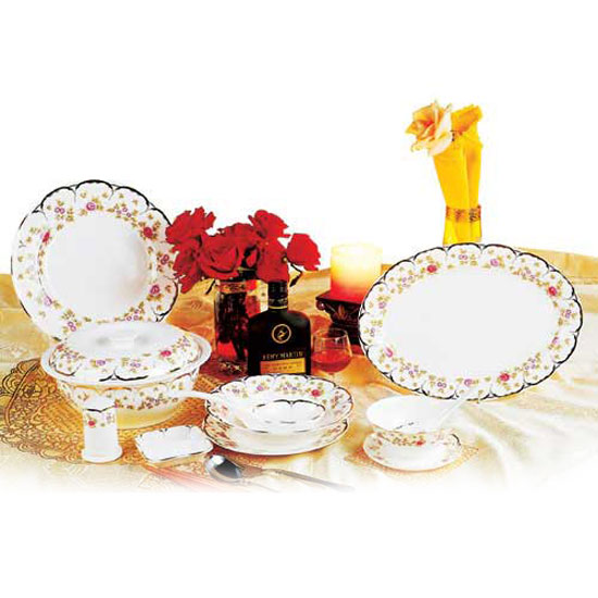 This ceramic dinner set includes plates, bowls, dishes, spoons, etc. Each piece of the elegant tableware is adorned with vibrant rose patterns along the rim. The beautiful dinner set is perfect for serving distinguished guests.