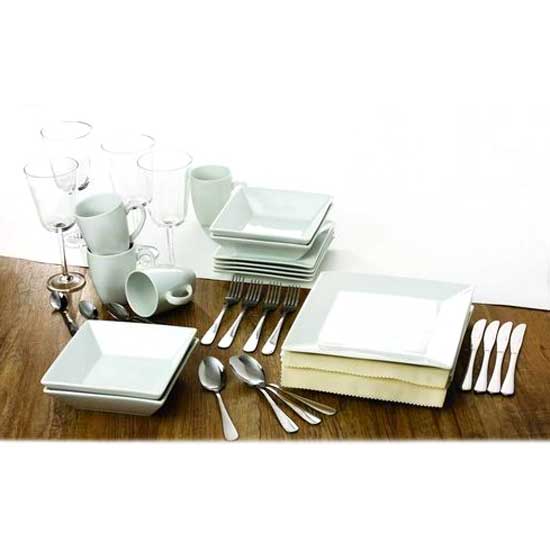 This dinner set includes 36 pieces like square plates, cups, wine glasses and so on. It is made of AB-grade porcelain with extra whiteness. This stylish dinner set is an excellent addition to your modern households.