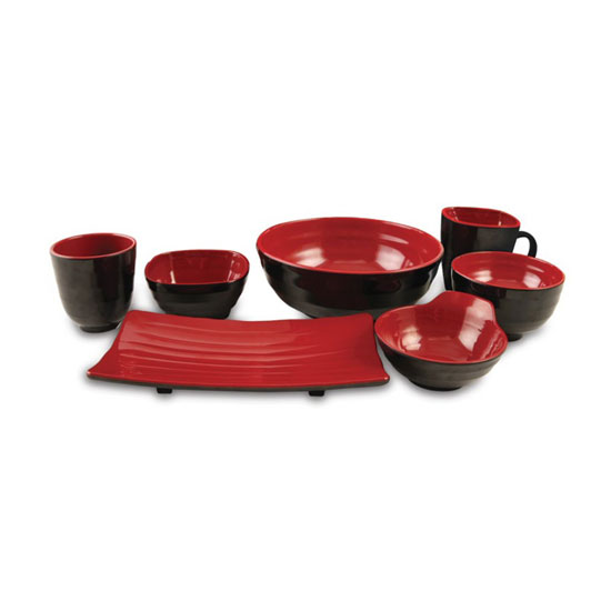 This dinnerware set includes four bowls, two cups and a plate with a matching design. The two-toned appearance in red and black creates a striking effect. Made of top-quality material, this dinnerware set is highly reliable for daily use.