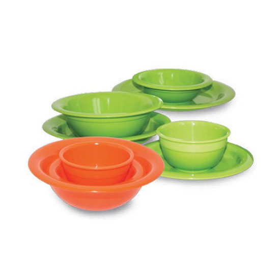 This dinnerware set includes pieces of bowls and plates in orange and green. All the pieces are made of safe and non-toxic material for ultimate reliability. This dinnerware set is easy to clean and maintain.