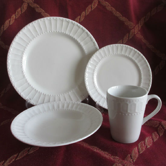 This is an embossed dinnerware set with a stylish and elegant design. It comes with four dinner plates, four soup plates, four dessert plates and four mugs. This dinnerware set is made of quality porcelain for durability.