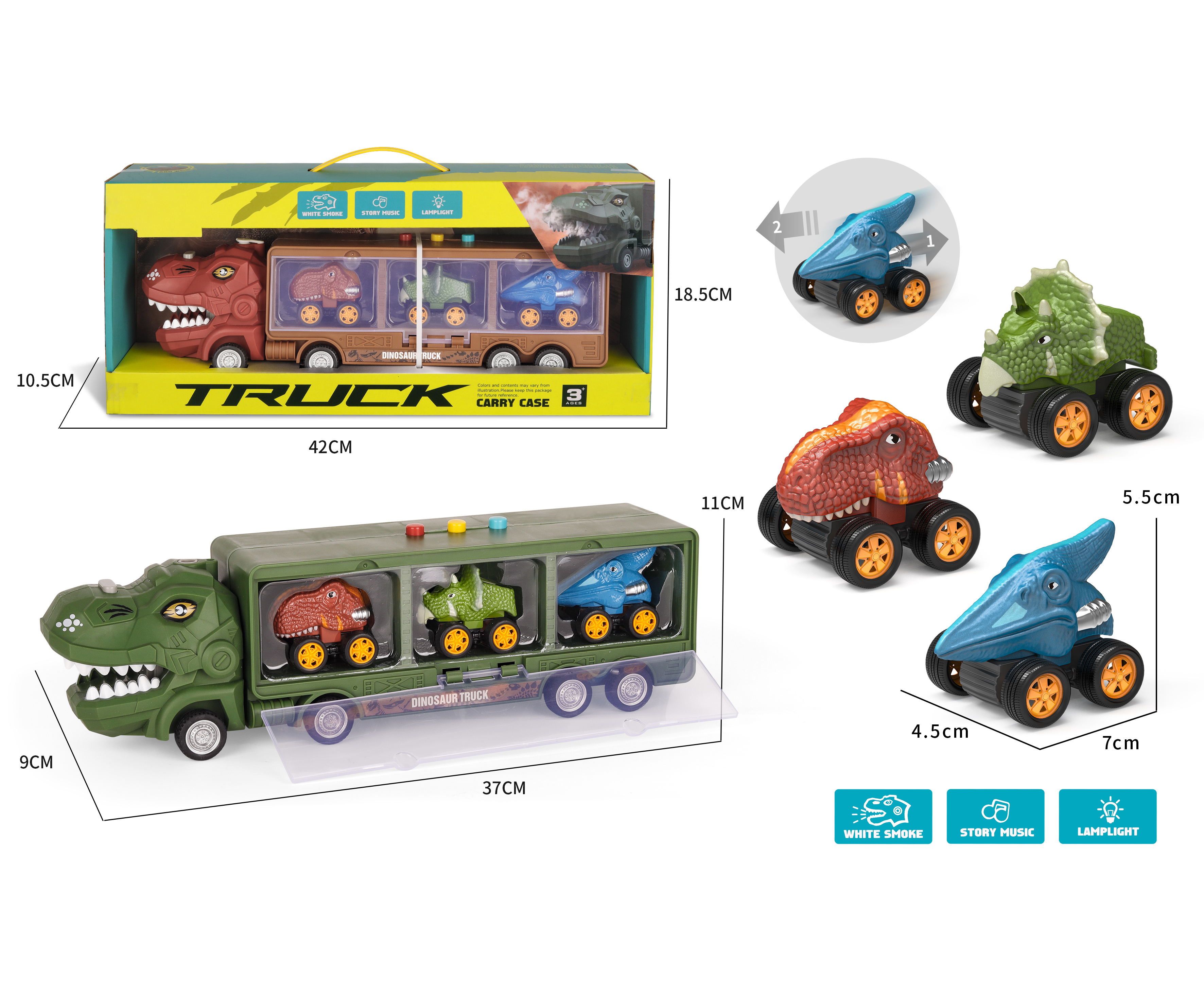 Dino Truck with collection container W/Alloy Pull back Dino Cars W/ Mist Spray feature,light and sound