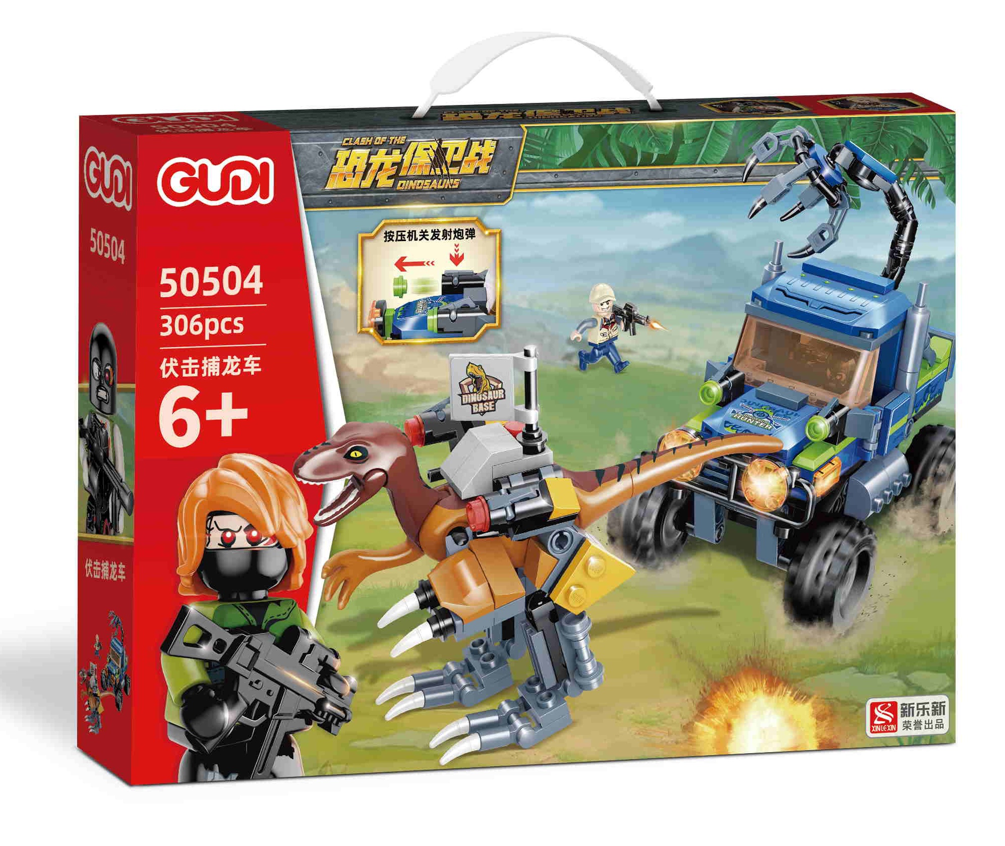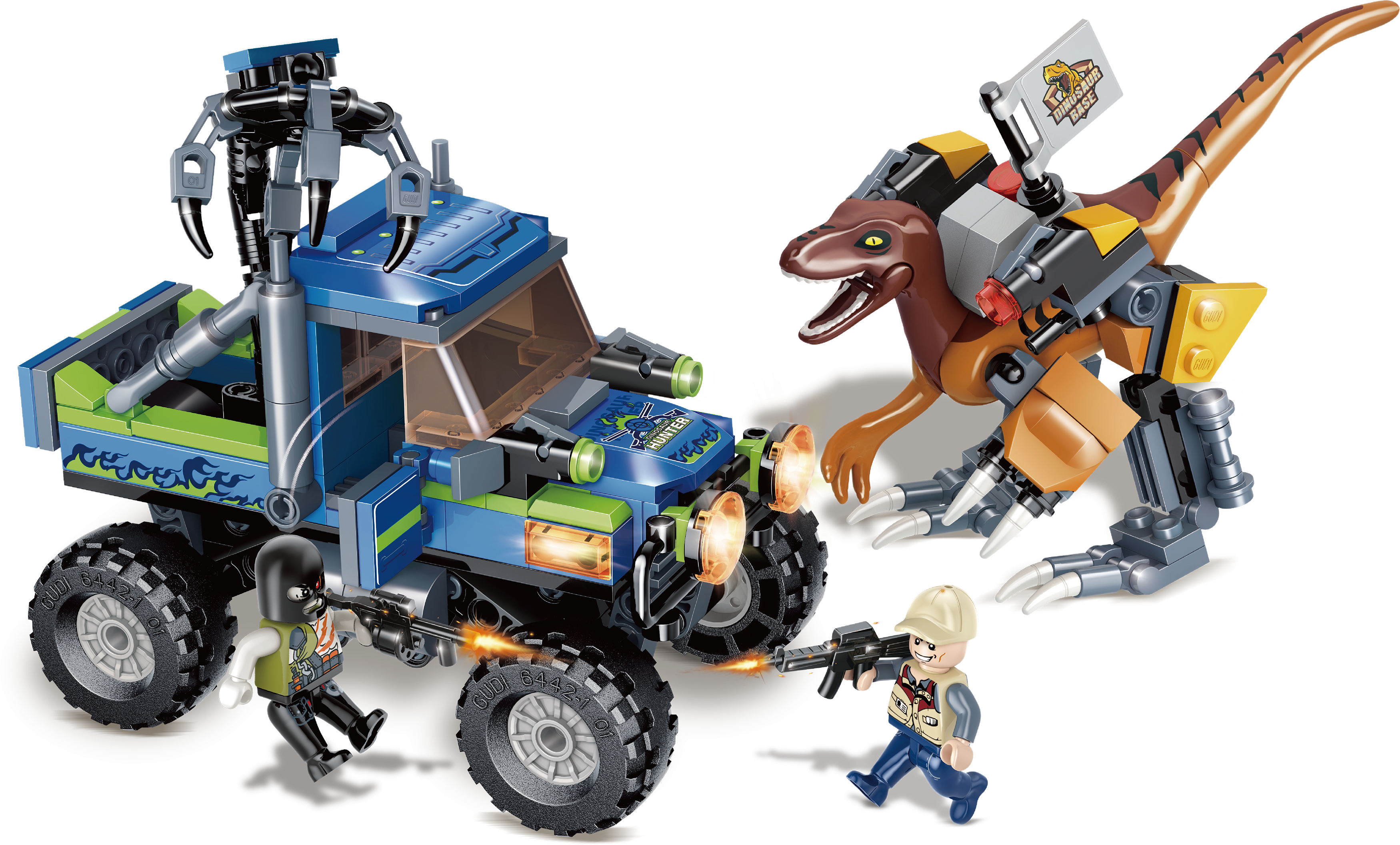 One set includes a climbing car and a dinosaur.