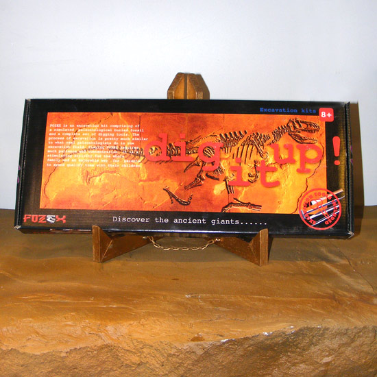 The featured item is a toy kit of dinosaur toy models. Children are required to use digging tools to look for the fossil from the sand. It is a stimulating game for families.