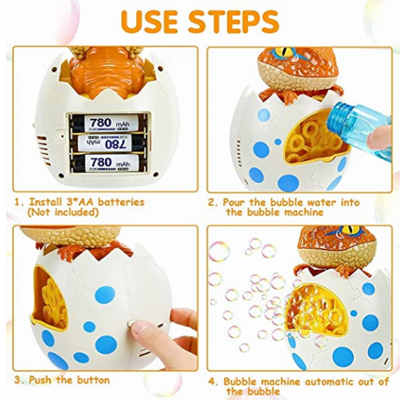 Light Weight: The size is 7*4.3 inches. The package contains 1 dinosaur bubble machine (3 AA batteries not included), 1 bubble solution. The dino bubble machine is light in weight and can be carried with you everywhere!