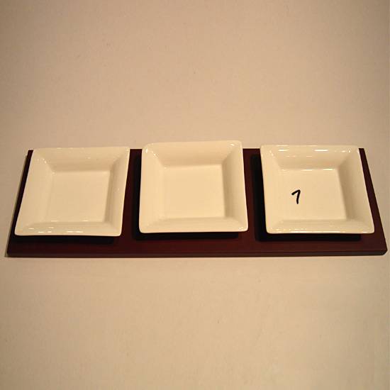 The dip dish set features 3 flesh-colored square dip dishes with shallow bases. The set is complemented with a long wooden tray to complete an elegant look. This dip dish set is ideal for serving various sauces.