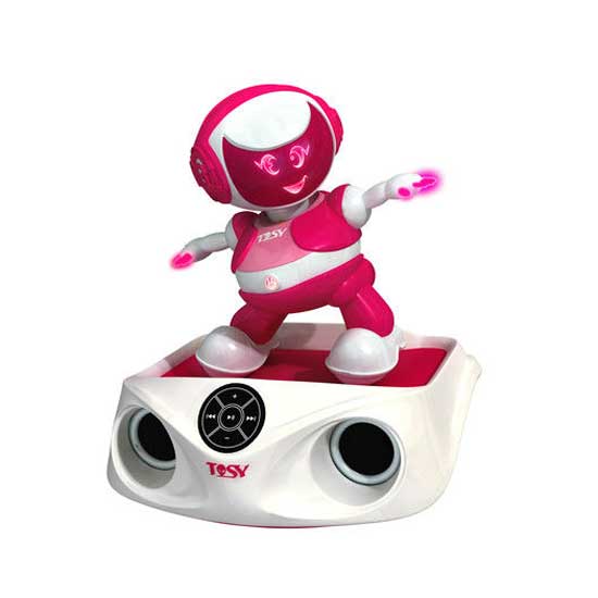 Displayed is a disco robot that dances with music. The pink robot stands on top of a speaker and does cool postures for your entertainment. This disco robot is a great choice for children to play with.