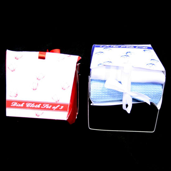 This dish cloth set consists of three textured cloths. Packaged in a printed paper bag with ribbon closure, this dish cloth set is functional yet appealing. This practical dish cloth set comes in handy anytime at home.