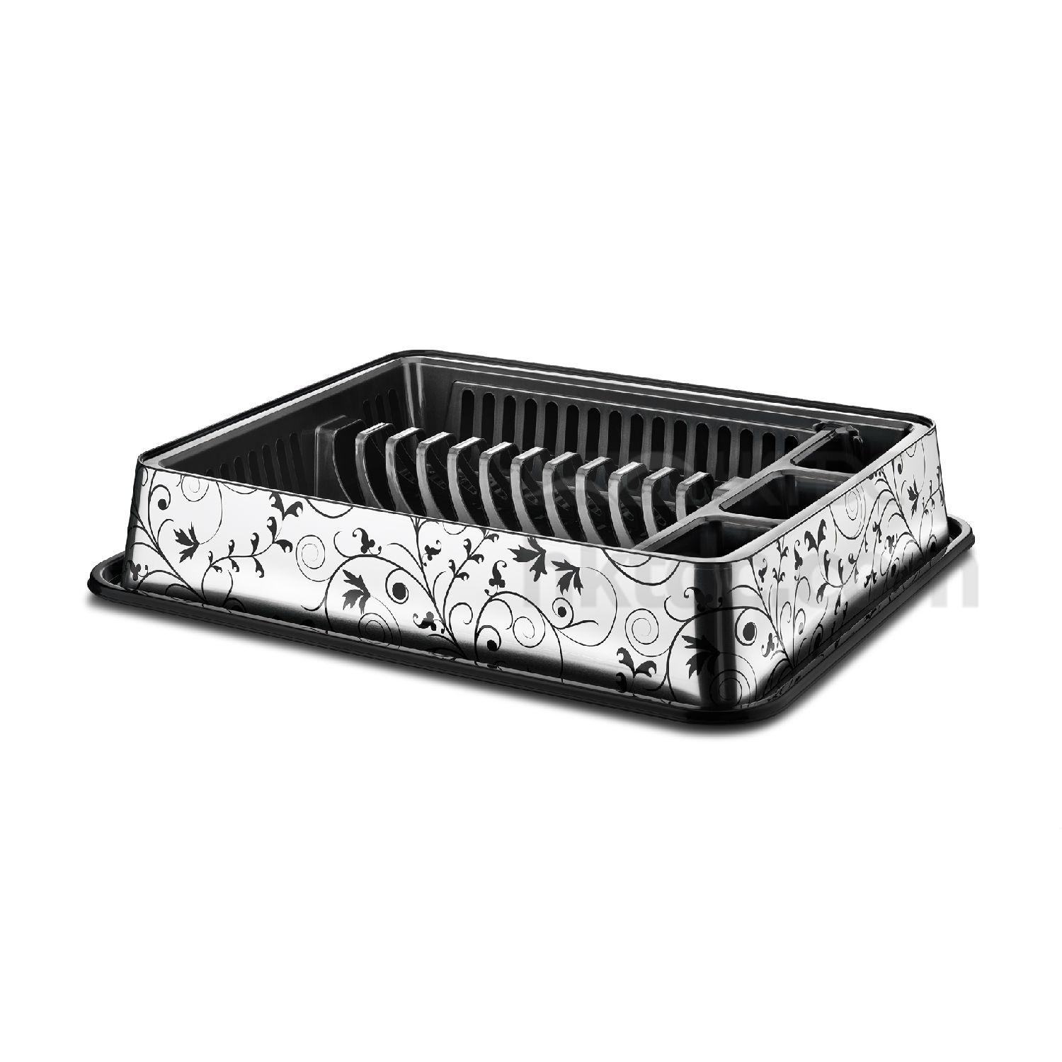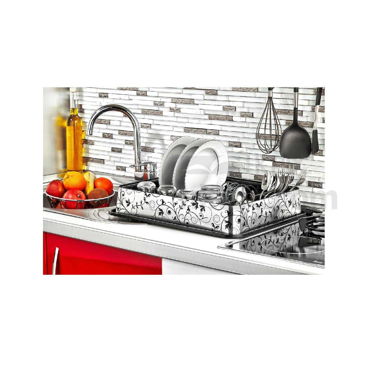 This is an elegant dish drainer that is made of top-quality material for enhanced durability. The attractive floral patterns add a touch of uniqueness to the whole piece. The simple yet modern design blends into any kitchen decoration easily.This unique product is available in several designs and metallic colors for inox sinks and kitchens.