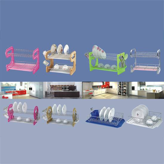 This is a collection of dish racks. The collection features metal envelop rack allowing quicker drying. There are also different compartments for other items, such as bowl, cutleries.