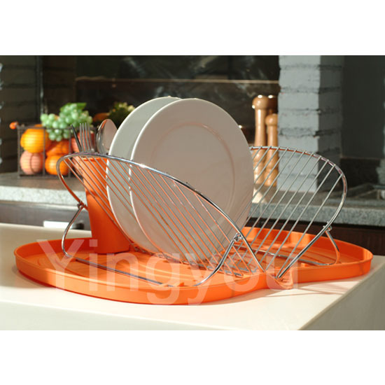 Simple design and chrome wire made dish rack saves space for your kitchen. It features a lovely pink plastic base and a chopstick holder.