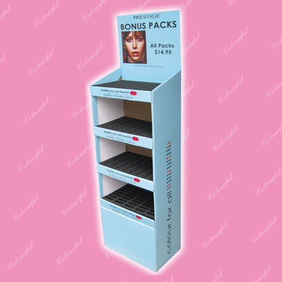 This is a cardboard display stand with four layers. It is designed in light blue for an attractive look. This stylish display stand is a must-have addition to shops.