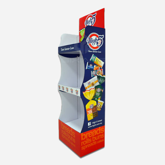 This is a three-layered display stand with a stylish design. It boasts a robust housing for a long service life. This cardboard display stand is designed with colorful prints for an eye-catching look.