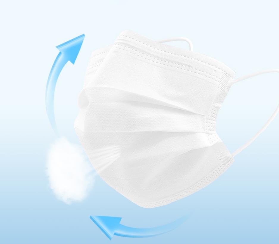 Features: Made of non-woven fabric and melt-blown fabric, including mask, nose clip, ear-loop band. The first layer is blue non-woven fabric(34%), middle layer is melt-blown fabric(30%); third layer is white non-woven fabric(30%),nose clip, ear-loop band(6%).