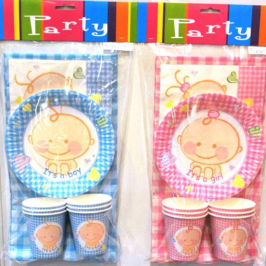 The featured items are sets of disposable tableware. They include dish, cups and paper napkins.