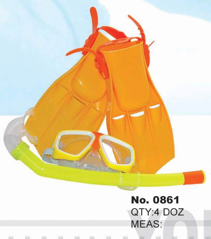 This diving set includes a pair of diving goggles, a snorkel and diving fins. The diving goggles have high-quality PC lenses, a PVC face skirt and an adjustable head strap. The PVC snorkel is extremely sturdy.