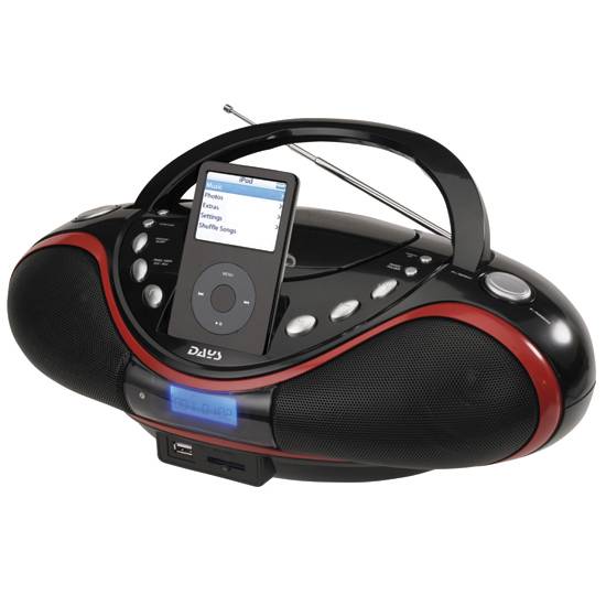 The boombox as shown comes with a docking station designed for MP3 players such as iPod. It includes a top loading CD player. A LCD display with blue backlight is attached for indication.