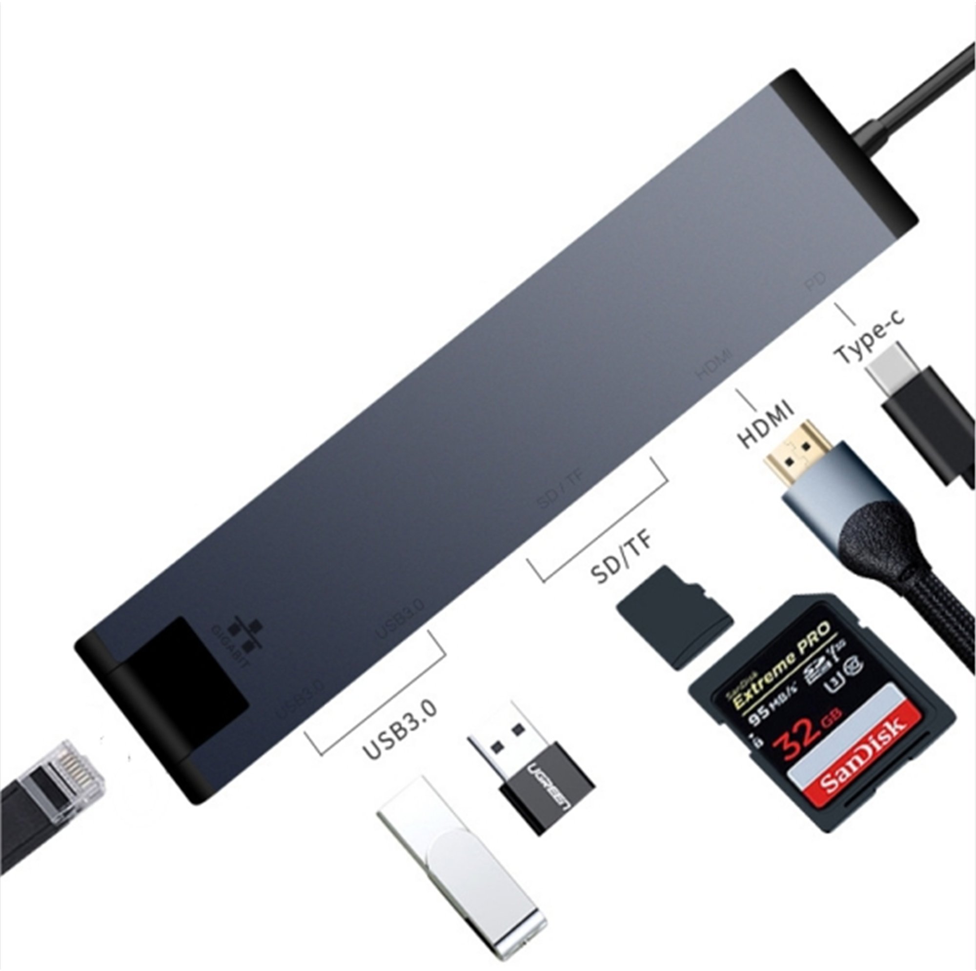 11 in 1 Type C to 4*USB3.0+Gigabit Ethernet+PD+SD/TF+4K@30Hz HDMI+VGA+NVME SSD enclosure