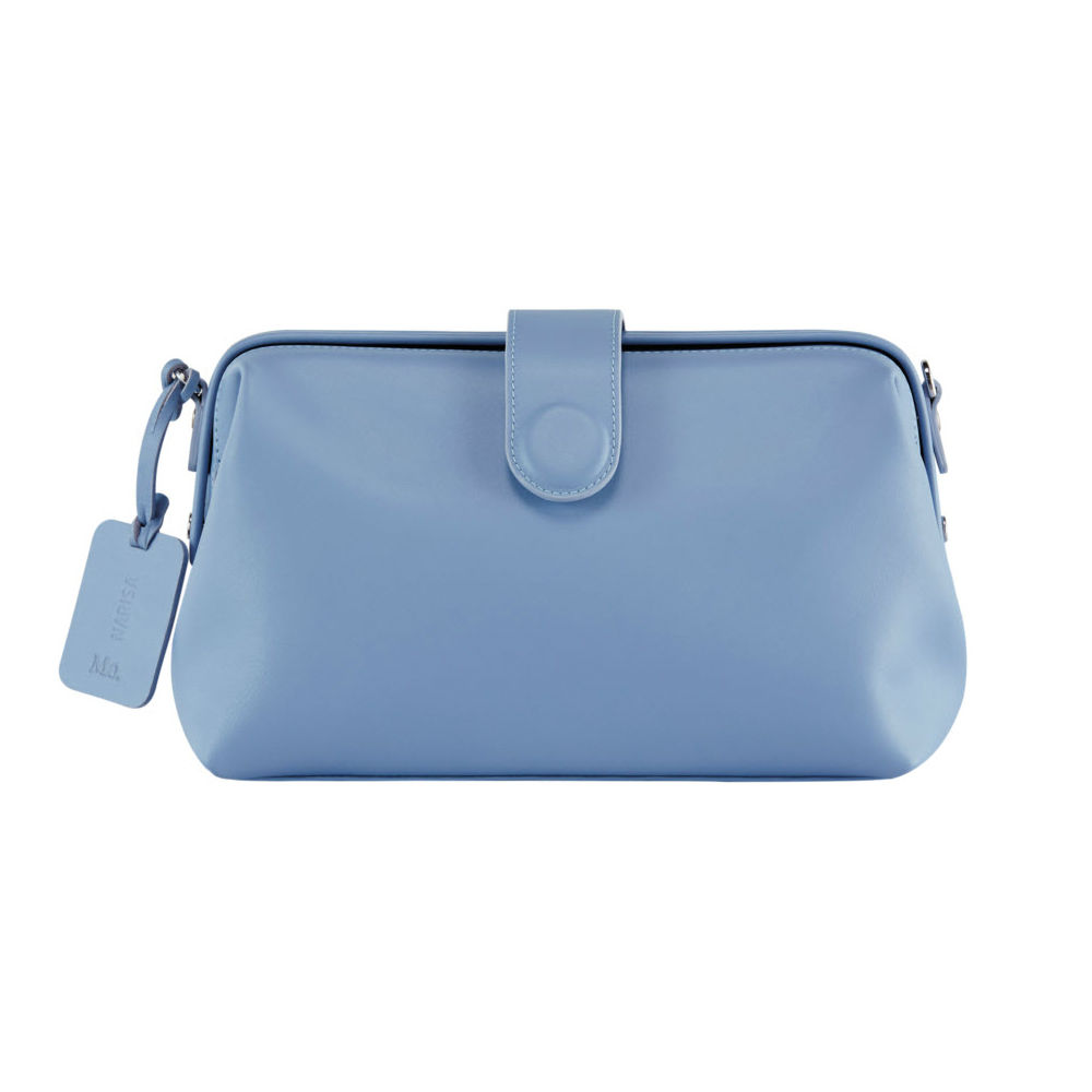 Perfect to carry you from day to night, this bag showcases delicacy with a smooth leather finish, sleek trapezoidal profile, minimalistic design, and striking blue hue. This compact carrier features a removable shoulder strap, looking great no matter being carried across the body, over the shoulder, or wrapped around the wrist.
