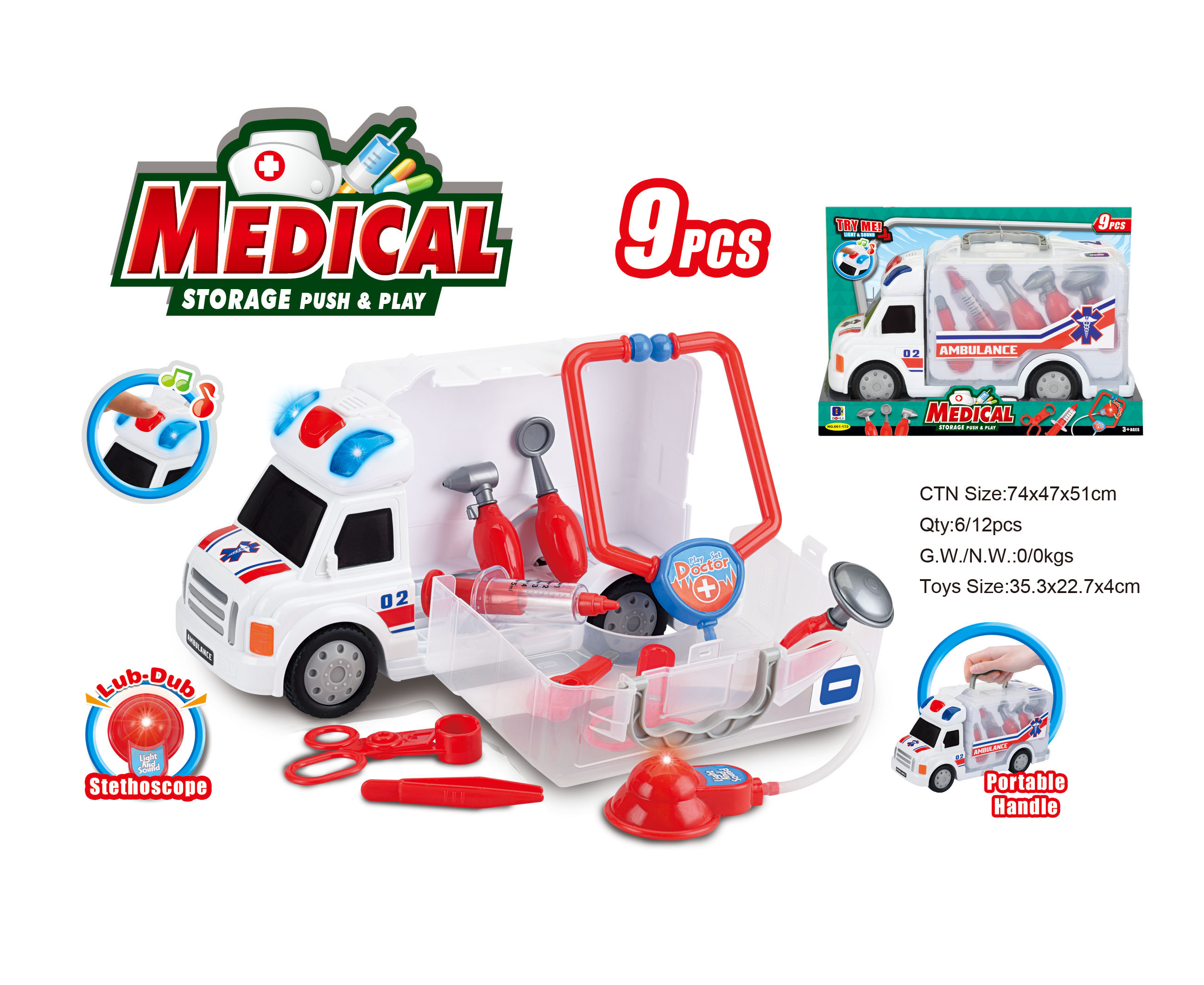 • Doctor set with 9 pcs, portable handle box with light and music, 4*AG13, included, 18pcs in a carton