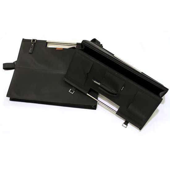The professional document bag boasts a trendy half-folded design to create an easel stand. The lightweight stainless steel handles offer a touch of uniqueness and added style. This delicate document bag makes an ideal executive briefcase for work or travel.