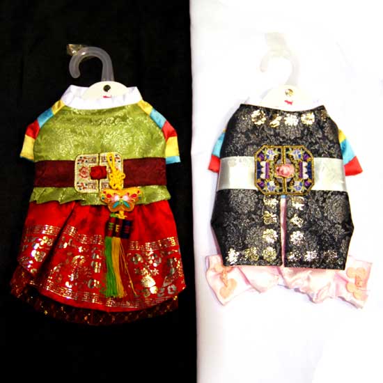 Displayed here is a dog clothes set that comes with two pieces. One is for male and the other for female. They are traditional Korean-style costumes that come with multiple colors.