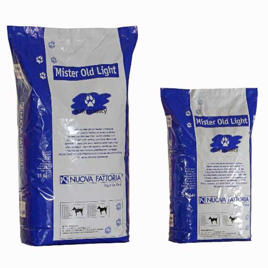 Shown here is a big pack of pet food designed for old dogs. The food is made of a range of well-selected ingredients, including extruded maize, meat, fish flour, etc. The food is palatable to dogs and will help maintain their health.