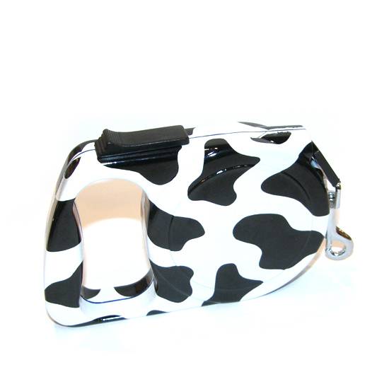 • This particular leash comes with a thick plastic handle with a black and white cow patches pattern.