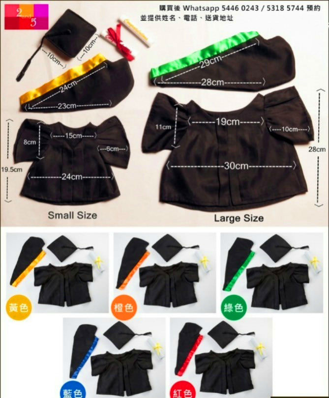 These graduation attires are available in two sizes to dress up your favorite doll for the special day. The bachelor hood renders in assorted colors to represent different disciplines. These graduation attires are made of quality materials for a soft touch.