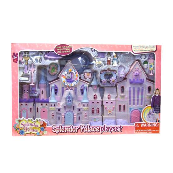 This is a set doll palace and small accessories such as a prince, a princess, horses, a carriage and a fountain. The doll house comes with a handle for carrying, which has a glittering light and sound function.