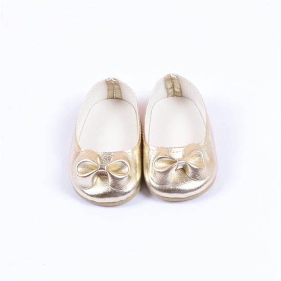 This pair of doll shoes is spectacular with a glossy golden finish. It features bow decorations for an enhanced lovely touch. These shoes pair equally well with dresses and pants.