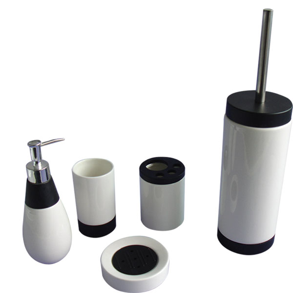 • Set of 5 dolomite bathroom set with black plastic holder, include lotion pump, tumbler, brush holder, soap dish and toilet brush holder.