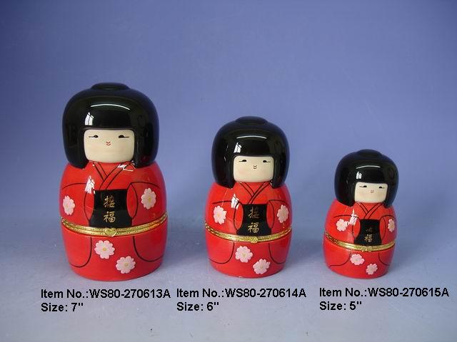 • Dolomite Japanese doll with size in D4" x H7", D3.5" x H6", D2.75" x H5".