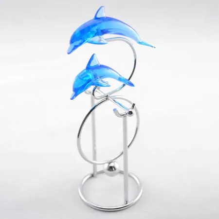 Presented here is a balance mobile featuring a pair of hopping blue dolphins. The charming clear animals and the simplistic structure are clean and intriguing. This balance mobile is a fascinating decoration and gift.