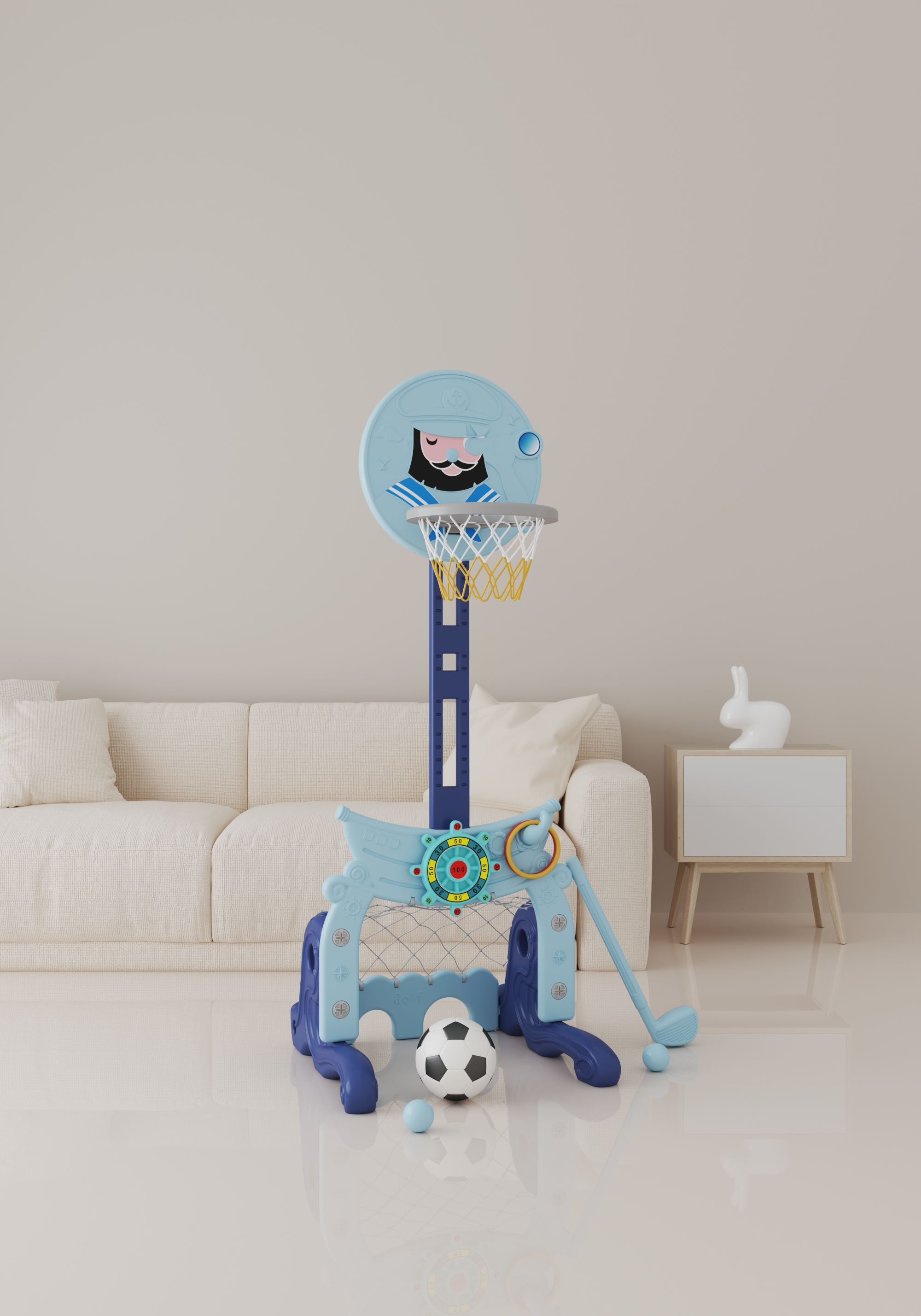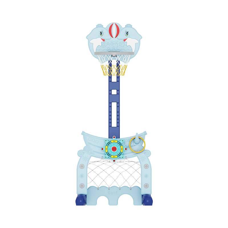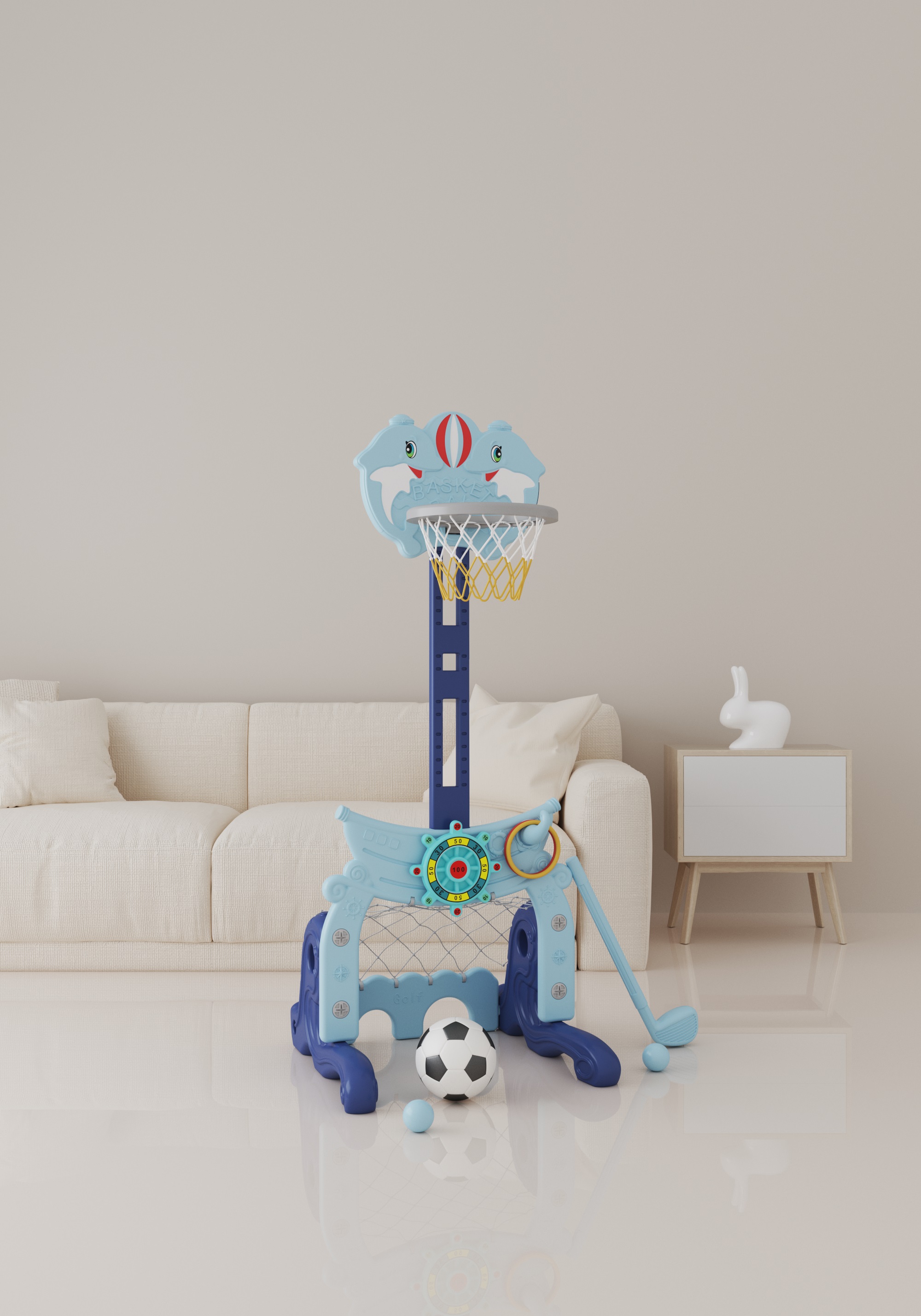 Dolphin/Captain theme Functional children plastic indoor adjustable height basketaball hoop stand with football and golf