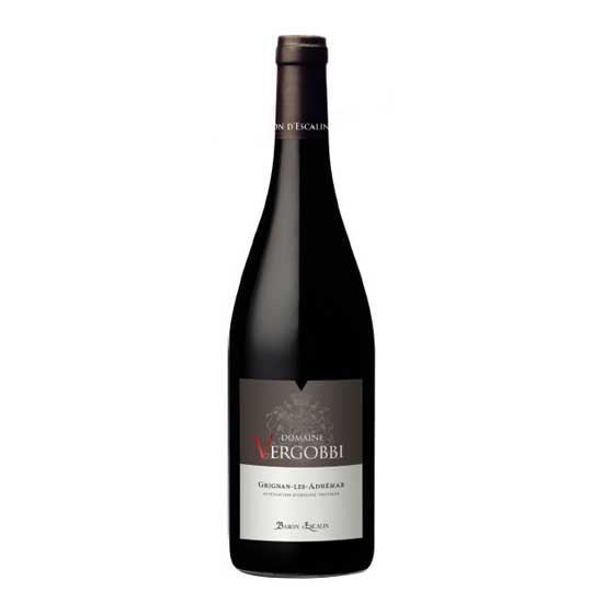 This is a bottle of Domaine Vergobbi by Baron d'Escalin. Made from a blend of Grenache and Syrah, this red wine is rich on the palate and fragrant on the nose. This elegant table wine goes well with meats.