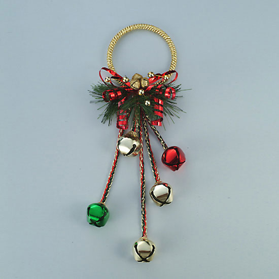 The decorative door hanger features 5 jingle bells with a shiny metallic finish. The ribbon and the imitation pine leaves create a festive touch. Welcome your guests this Christmas holiday with this jingle bell door hanger.