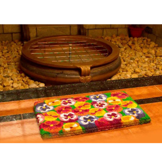 Shown here is an eye-catching door mat in fancy colors. It is characterized by the vibrant floral patterns. This door mat is highly durable and easy to clean.