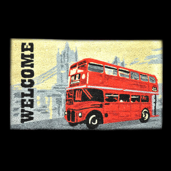 Shown here is a welcoming door mat boasting a retro design. The tufted surface features a retro London street scene in washed colors. This vintage mat is perfect to highlight cool interior settings.
