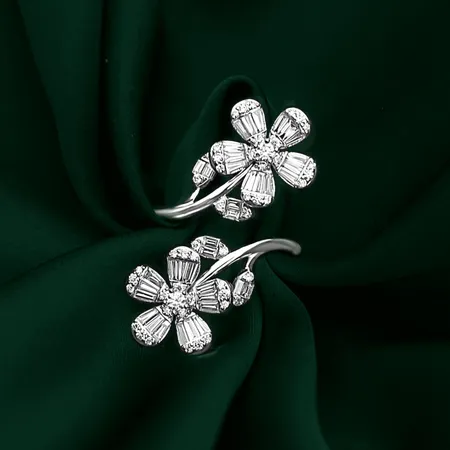 Brilliant round and baguette natural diamonds set in 18k white gold featuring a mesmerizing floral design in an open ring.