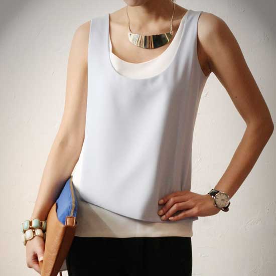 Displayed is a double-layer tank top coming in gray and white hues. It comes with a U-shaped neck on the chic layered appearance. This fashionable and cozy tank top is easy to mix and match.