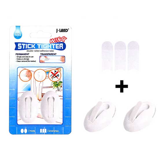The mounting set includes 2 hanging hooks and 3 adhesive strips. They hold onto a surface firmly and facilitate easy and damage-free removal. The double-sided adhesive tapes and hanging hooks provide an easy mounting solution for homes.