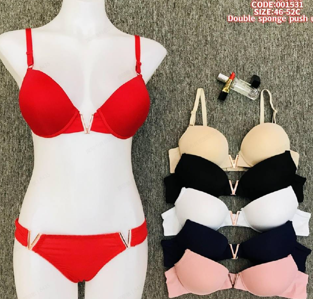 Enhance your intimate wear with this Double Sponge Push Up Lingerie Set. Featuring a push-up bra and matching panty with stylish V-logo details, this set is designed to provide excellent lift and a flattering shape. Available in sizes 46-52C (code 001531) and a range of versatile solid colors including red, beige, black, white, navy, and pink, it combines comfort and fashion seamlessly. The smooth fabric ensures a sleek look under clothing, while the V-logo accents add a touch of sophistication. Perfect for those seeking a confident and polished look, this lingerie set is ideal for everyday wear or special occasions, offering both support and style.
