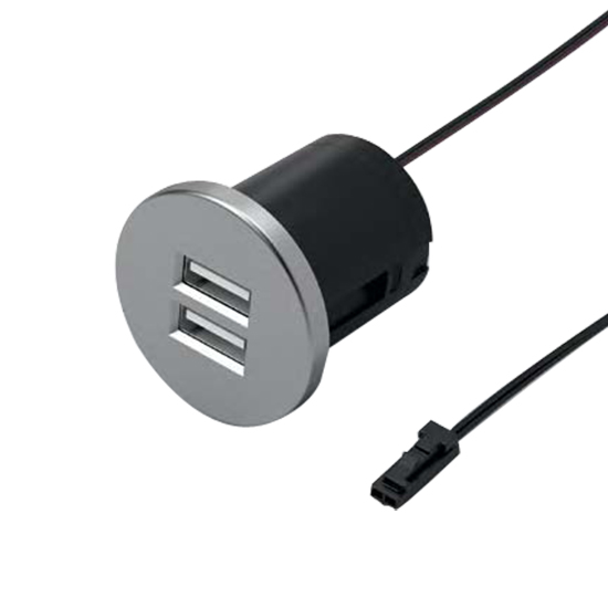 For recess mounting Bottom plate for extended fixing optional Finish: silver coating Input: 12V DC 2.0Amp Output: 5V max.1 x 2.1A/2 x 1.05A Connection: 2M cable with LED mini plug system Finish: silver coated