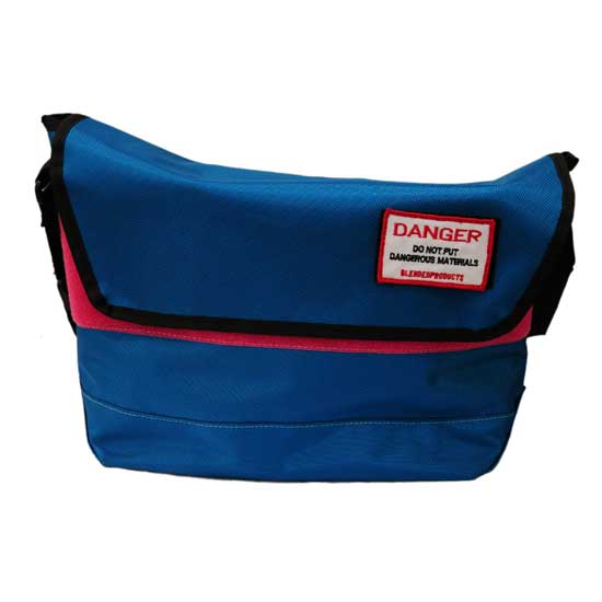 Displayed is a messenger bag designed in a sharp blue-and-red color combination. The bag is carefully made with 1,680 double-yarn PVC for enhanced durability and density. The bag makes a smart-casual choice for daily go-out.