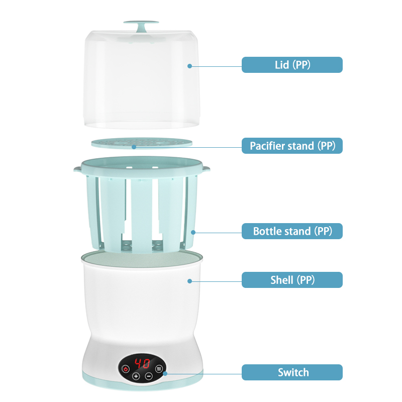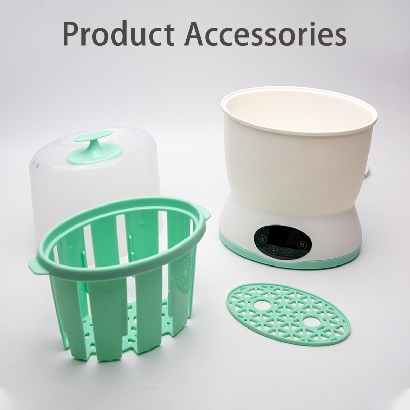 * Large capacity design simultaneous heating or sterilising 2 bottles with sterilization rack and handle.