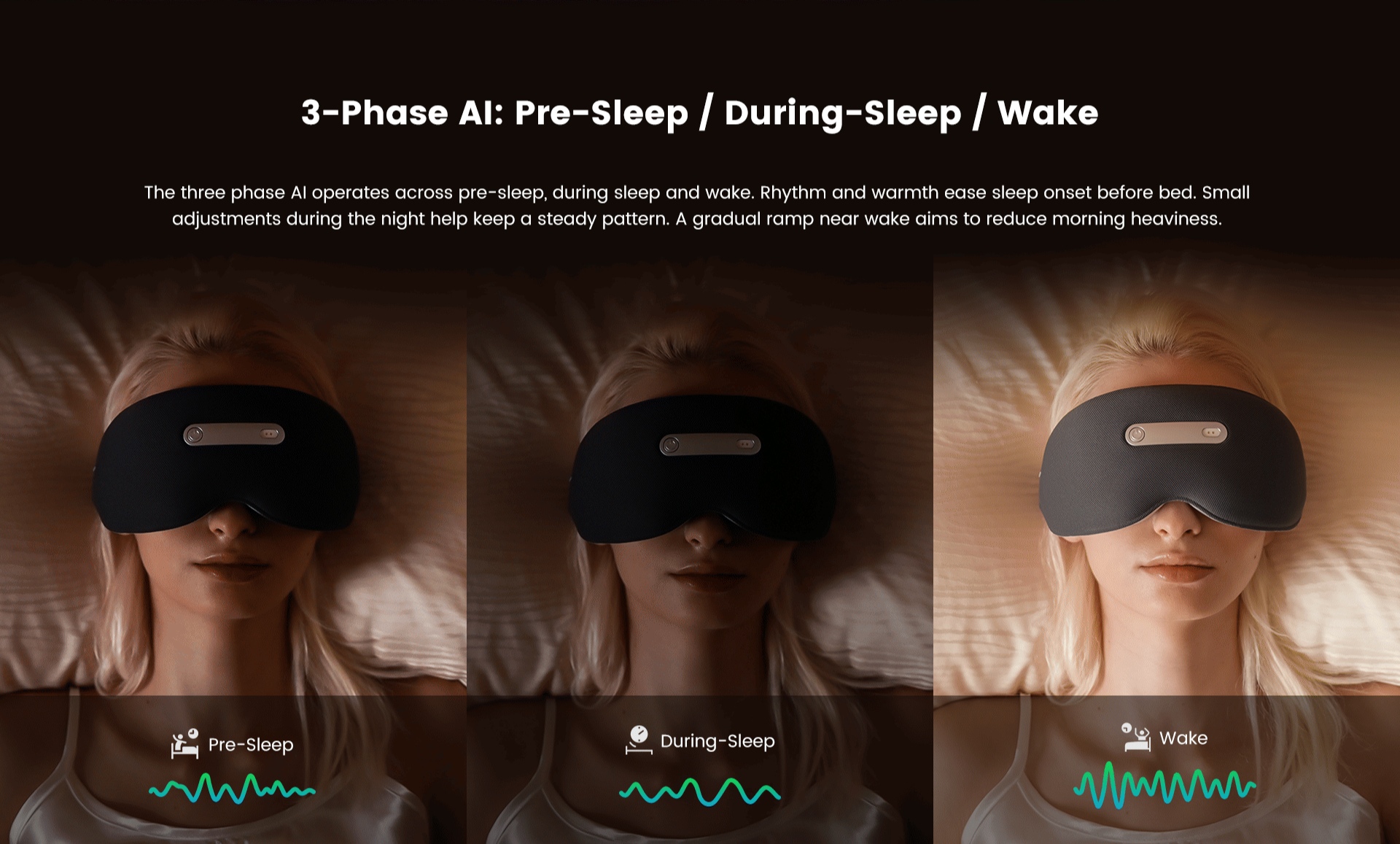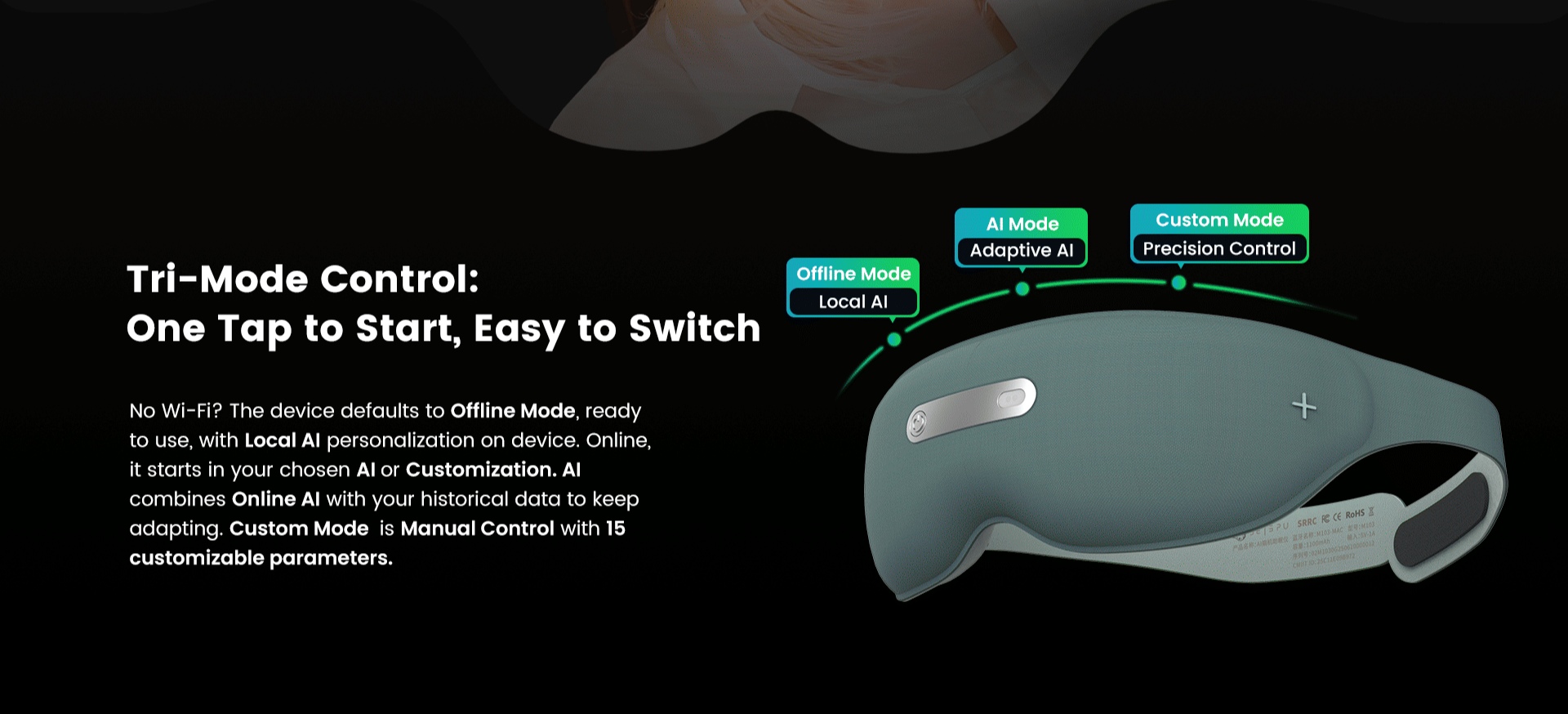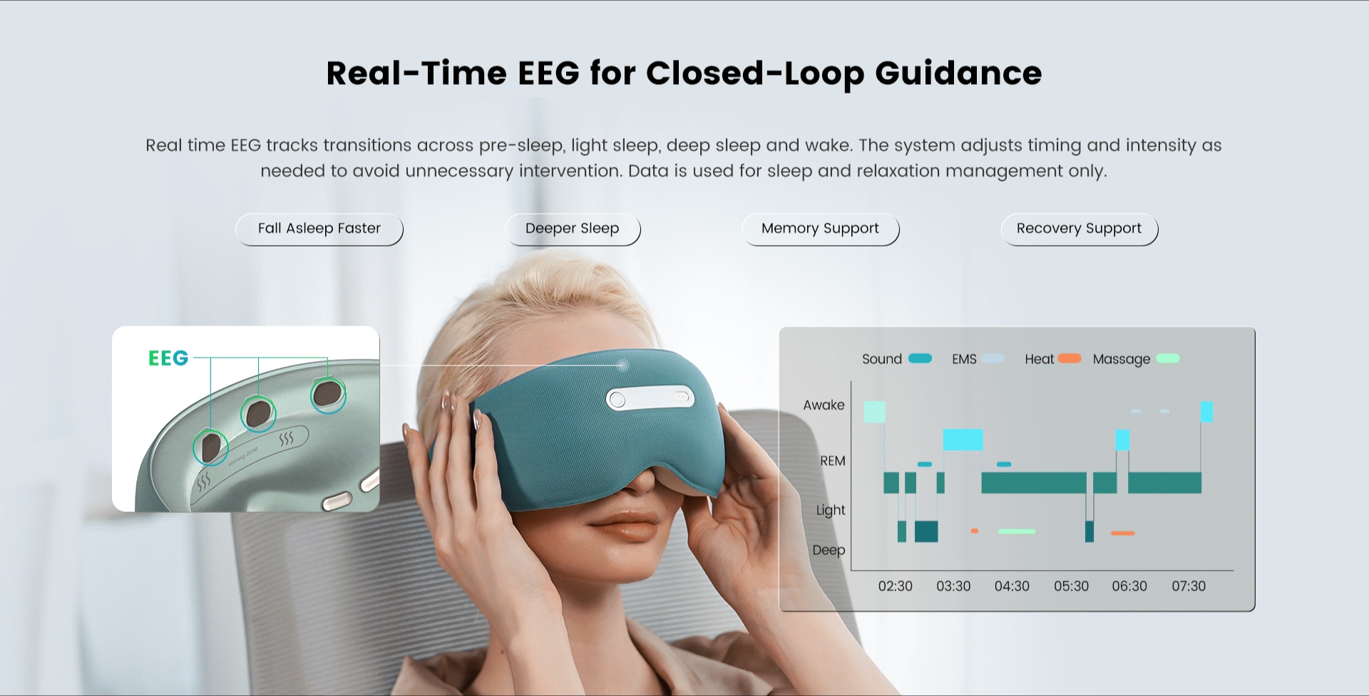 The world's first sleep mask integrating BCI technology, EEG and AI algorithms, exclusively enabling real-time monitoring and intelligent regulation throughout all sleep stages—before, during, and wake-up. It improves falling asleep speed by 50% and deep sleep ratio by 30%. Its 4D sleep-tech stack combines BBT binaural beats, far-infrared heat therapy, EMS stimulation, and vibration massage, paired with a 100% light-blocking zero-pressure eye mask. Suitable for multiple scenarios including home sleep, travel, and environments with light interference, it works reliably both online and offline—redefining a new approach to scientific sleep.