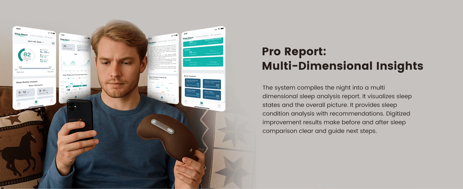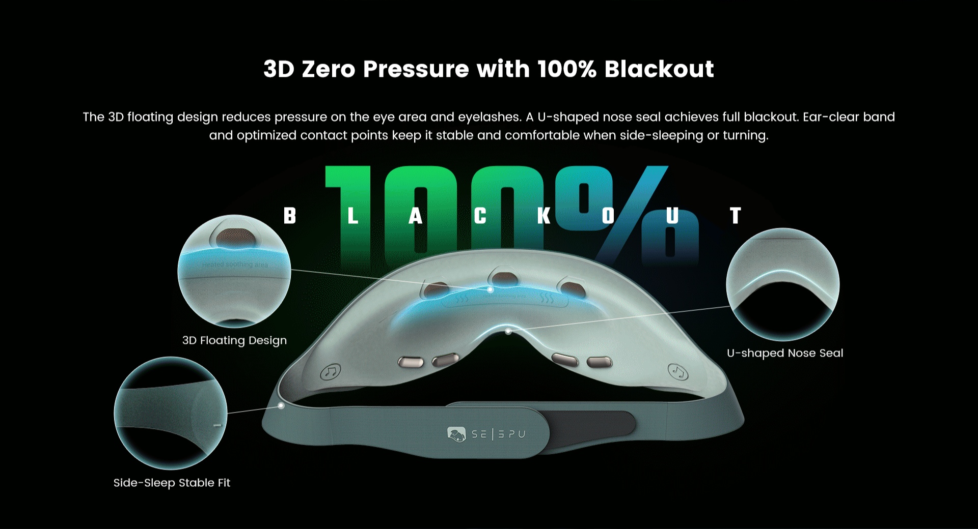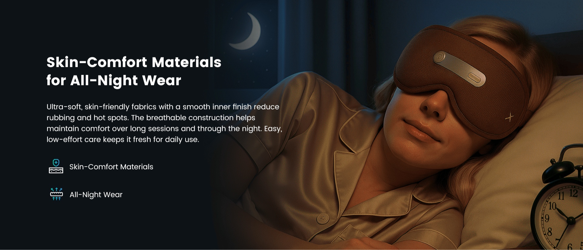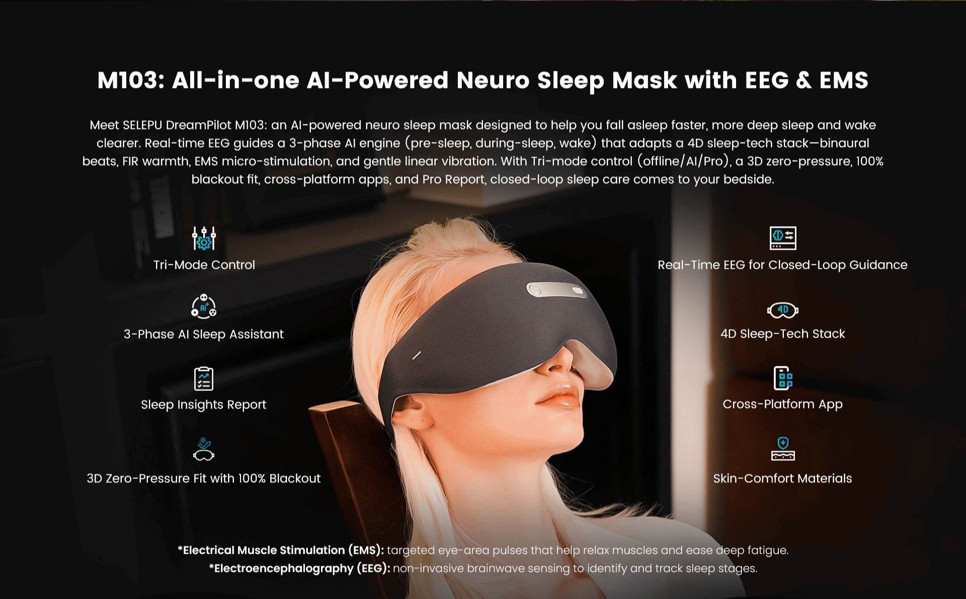 The world's first sleep mask integrating BCI technology, EEG and AI algorithms, exclusively enabling real-time monitoring and intelligent regulation throughout all sleep stages—before, during, and wake-up. It improves falling asleep speed by 50% and deep sleep ratio by 30%. Its 4D sleep-tech stack combines BBT binaural beats, far-infrared heat therapy, EMS stimulation, and vibration massage, paired with a 100% light-blocking zero-pressure eye mask. Suitable for multiple scenarios including home sleep, travel, and environments with light interference, it works reliably both online and offline—redefining a new approach to scientific sleep.