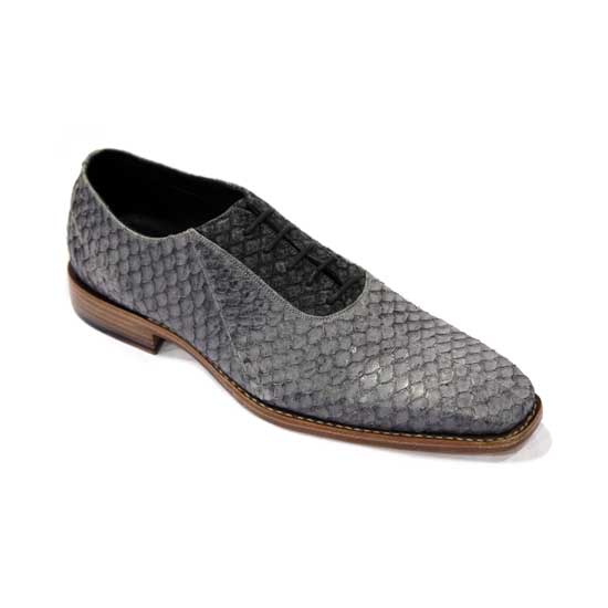 This is a pair of dress shoes with a fashionable and modern design. It is made of high-quality leather with fish-scale patterns in gray. The shoelace part is crafted in deep black with a black lace for added style.