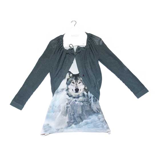This dress and cardigan set is a perfect to wear on casual occasions. The thigh length dress is digitally printed with a vivid wolf motif. The cardigan is designed with a string closure and a front button closure.